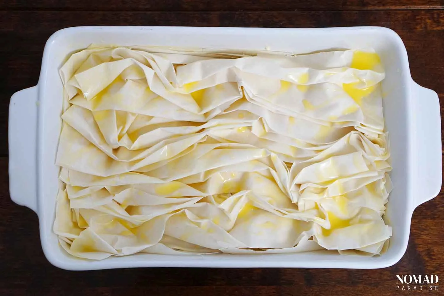 - Now, we’ll take 4 filo sheets and bunch them up on the long side and add them to the baking dish, side by side, sprinkling melted butter on top of them with a pastry brush or spoon.